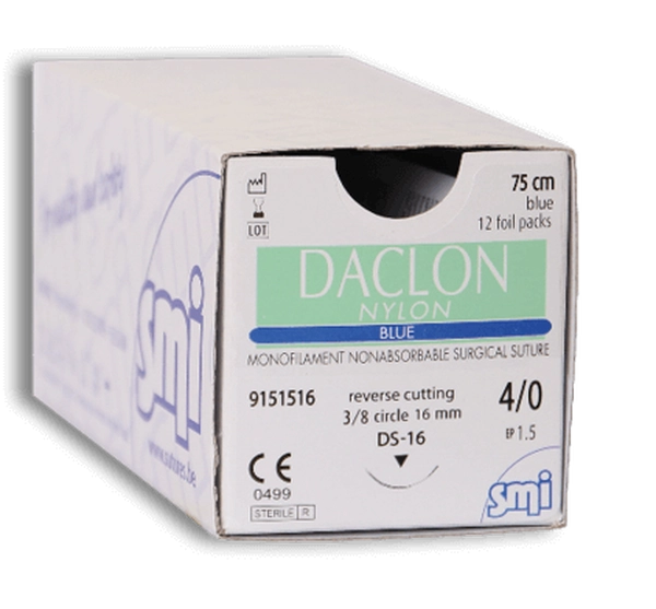DACLON Nylon so šivi belgijskega proizvajalca SMI najvišje kakovosti. Izdelani so iz enonitnega nylonskega vlakna. Površina je tako povsem gladka, popolna odsotnost kapilarnega učinka, rast bakterij je onemogočena. Povzročajo minimalno reakcijo z tkivom. Niso absorbilni. Pakiranje: 12 kosov.