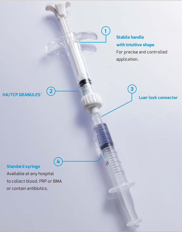 Enostavno rokovanje in obdelava z granulami HA/TCP v aplikatorju.