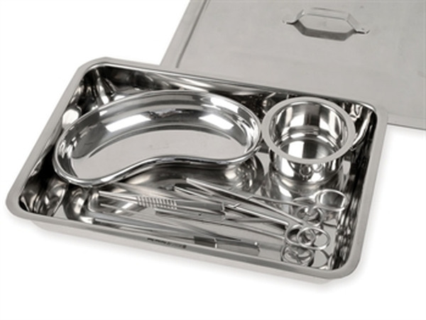 - Posoda za instrumente inox 25x30x6.2 cm; - posoda (ledvička) za odpadke, 20 cm; - inox posodica 150 ml; - 2 pinceti (16 in 18 cm); - Mayo škarje ravne 15 cm; - 2 prijemalki;