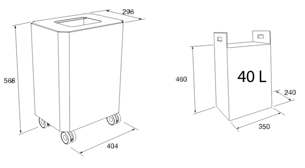 Zunanje mere 40l/60l: 404/600 x 296/330 x 568/640 mm