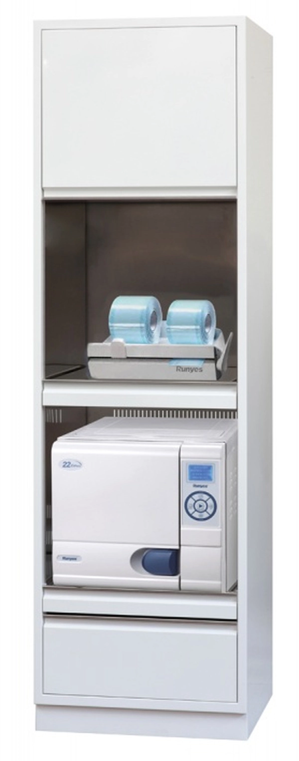 Kovinska omara je oblikovana tako, da vanjo namestite in shranite vse potrebščine za sterilizacijo. Premišljeno ima nastavljeno višino police za oba aparata ter tako omogoča enostavno rokovanje z njima.