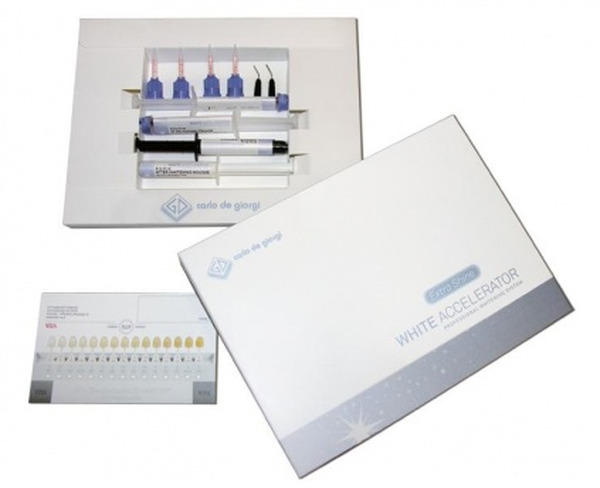 EXTRA SHINE je dvokomponentni sistem (kemijski del sistema), ki temelji na 37,5% vodikovem peroksidu. Pakiran v injekcijskih brizgah 4:1 zagotavlja večjo stabilnost in učinkovitost, ker mešanje med uporabo dokazano proizvaja večjo količino kisika, ki vpliva na rezultat beljenja. Je enostaven za uporabo in uporabniku zagotavlja maksimalno udobje med in po uporabi. Vsebuje namreč desenzibilne snovi. V sistemu prejmete 5 setov (cena posameznega seta je 99,00 €).