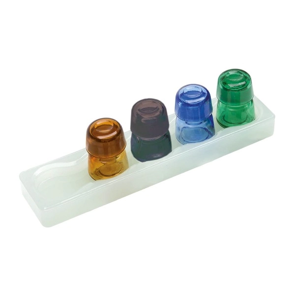 Steklena posodica z pokrovom je dobavljiva v štirih barvah: ambra, modra, zelena in prozorna.