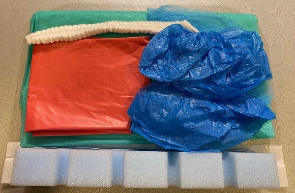 Vsebina: - zaščitni plašč, - 2 kapici m/ž, -1 zaščitni vizir, - 1 par prevlek za čevlje, - 1 vrečka za odpadke.