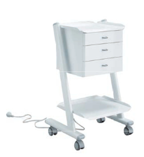 Asistent na kolesih EASY je izdelan iz barvane jeklene pločevine. Je praktičen, stabilen in odporen voziček z 3 predali, 1 polico spodaj in 1 na vrhu. Vsi predali imajo snemljive pladnje za lažje vzdrževanje. Vgrajene ima 3 elektro vtičnice, kar pomembno olajša rokovanje z aparati.
