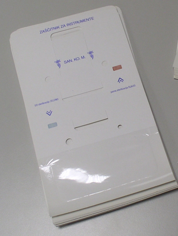 Zaščitni kartonček se uporablja za varno in zanesljivo sterilizacijo ostrih instrumentov (škarij). Dobavljiva je v dveh velikostih.
