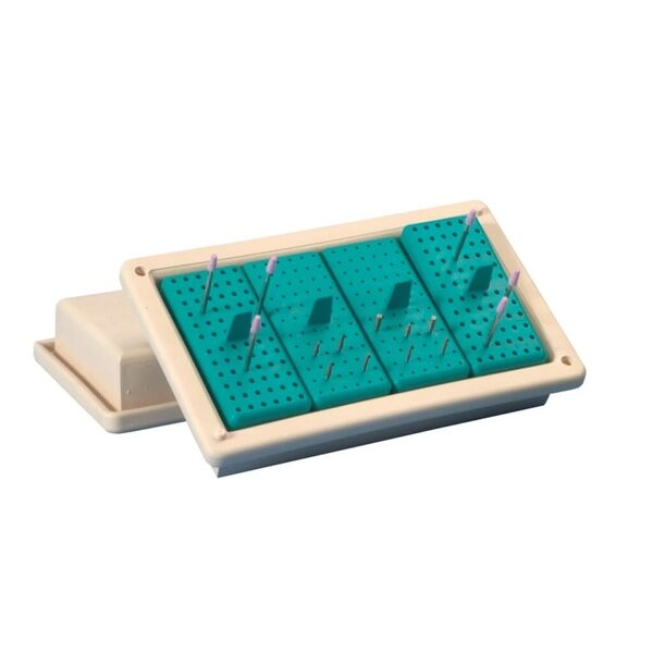 Box maxi za svedre je praktičen pomočnik v vsaki ordinaciji. Odprtine so namenjene FG ali RA svedrom. Box je primeren za avtoklaviranje, dobavljiv z pokrovom in snemljivimi polnili.