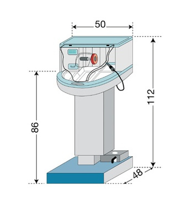 Dimenzije: širina komore 50 cm, globina podstavka in komora 48 cm, višina delovnega pulta 86 cm, celotna višina 112 cm.