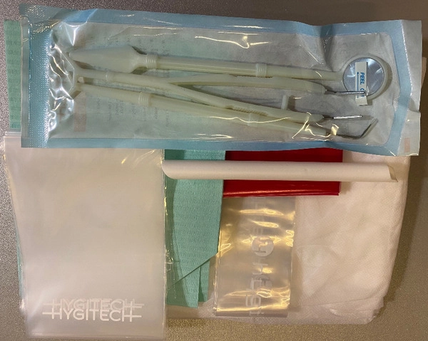 Vsebina: 1 pregledovalni set 3 instrumenti, 1 prevleka za dentalni stol enodelna, 1 prevleka za pljuvalnik z odprtino, 3 prevleke za cev/kabel 4,5x45 cm, 3 prevleke za cev/kabel 8,4x90 cm, 1 sesalec 11mm, 1 vrečka za odpadke.