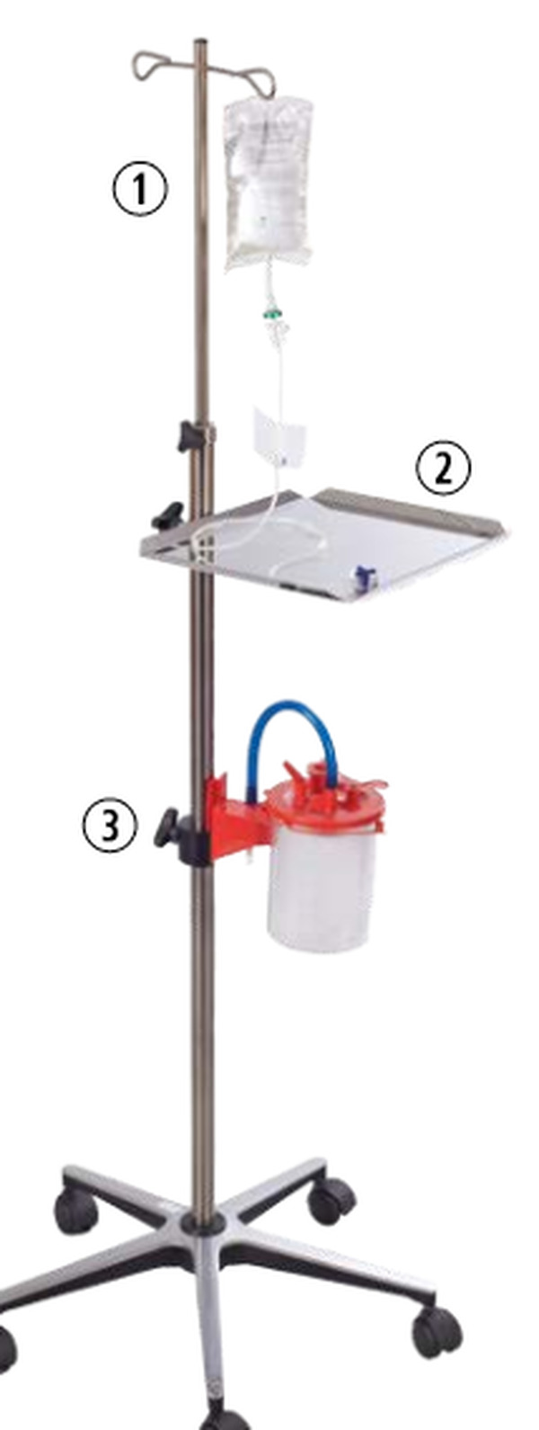Večnamensko stojalo je izdelano iz nerjavečega jekla in je podprto z podstavkom na 5-ih kolesih, ki zagotavljajo trdno podlago in enostavno mobilnost.